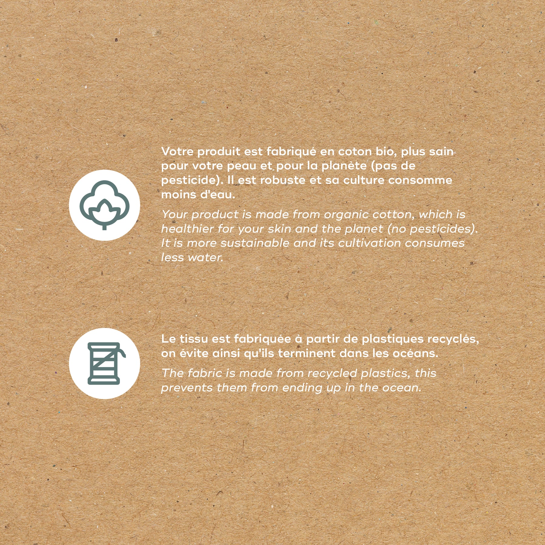 I tessuti utilizzati sono riciclati o biologici per offrire morbidezza e sicurezza alla pelle delicata del bambino.