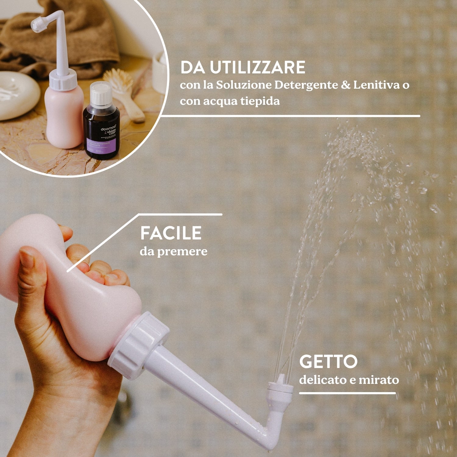 1. Riempire la doccia intima con acqua tiepida. Per ottenere un effetto ottimale, aggiungere 10 ml di Soluzione detergente e lenitiva