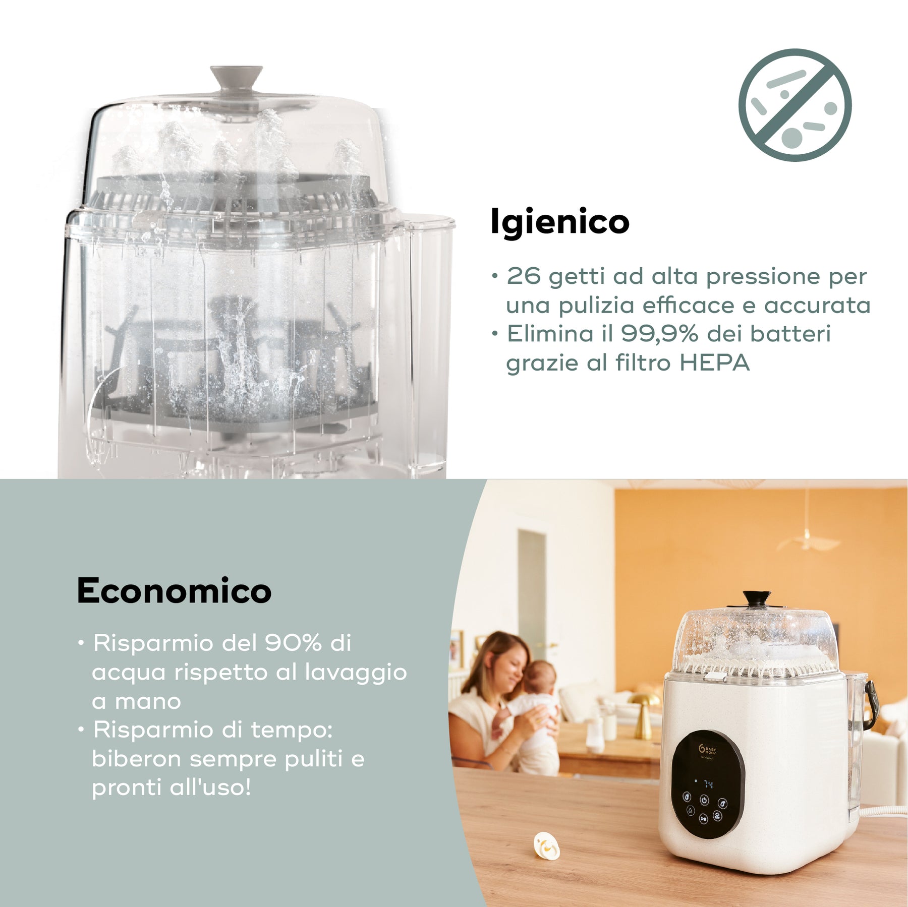 Grazie ai 26 getti d’acqua ad alta pressione e al vapore che elimina il 99,9% dei batteri, NutriWash assicura una pulizia profonda e una sterilizzazione che dura fino a 72 ore. Inoltre, consente di risparmiare il 90% di acqua rispetto al lavaggio manuale, per una soluzione ecologica ed efficiente.