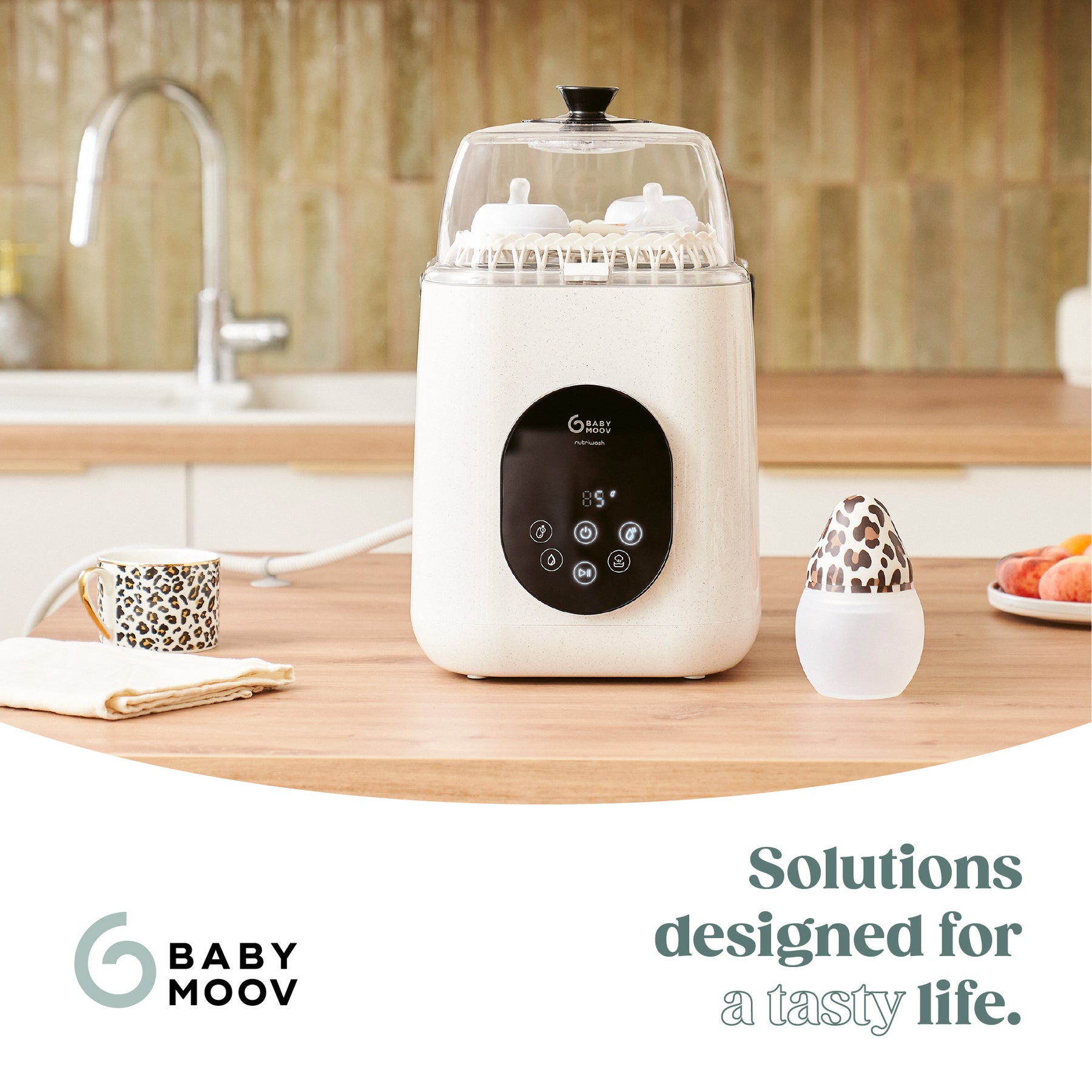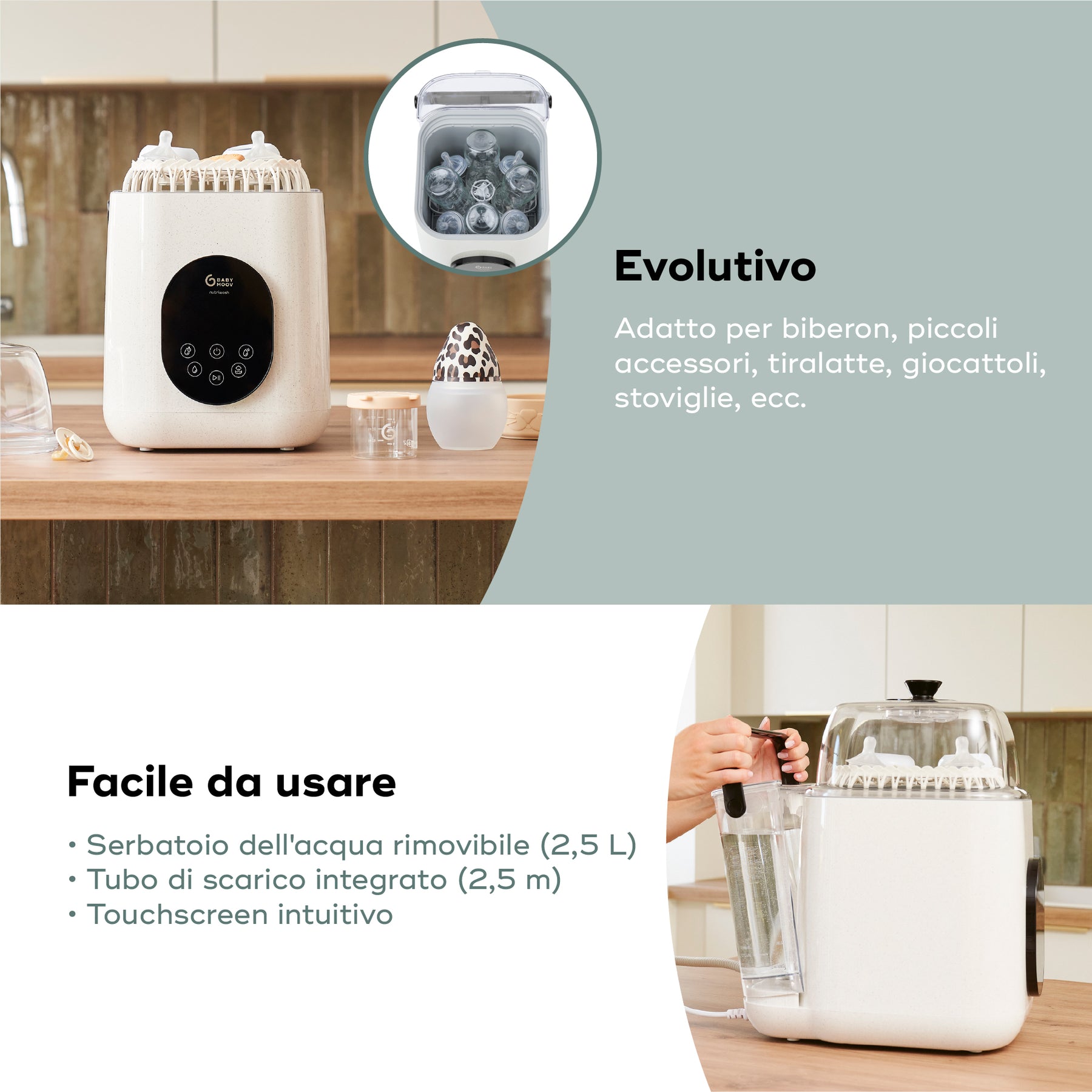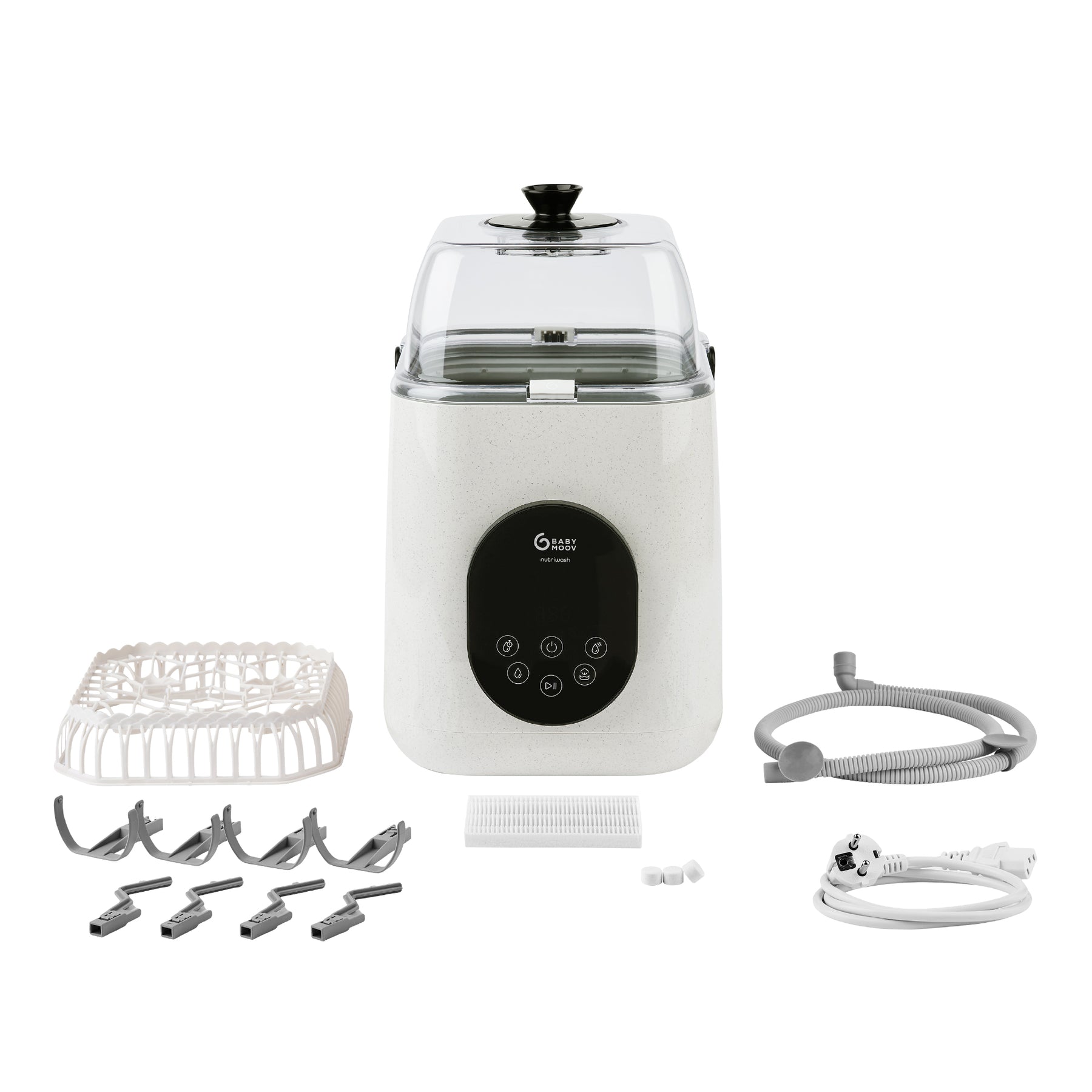 Con il suo serbatoio rimovibile da 2,5 litri, il tubo di scarico da 2,5 metri e il design moderno beige effetto minerale, NutriWash si integra perfettamente in ogni cucina. Realizzato con materiali robusti, offre garanzia a vita e include 60 pastiglie per la pulizia, per semplificare la vita dei genitori.