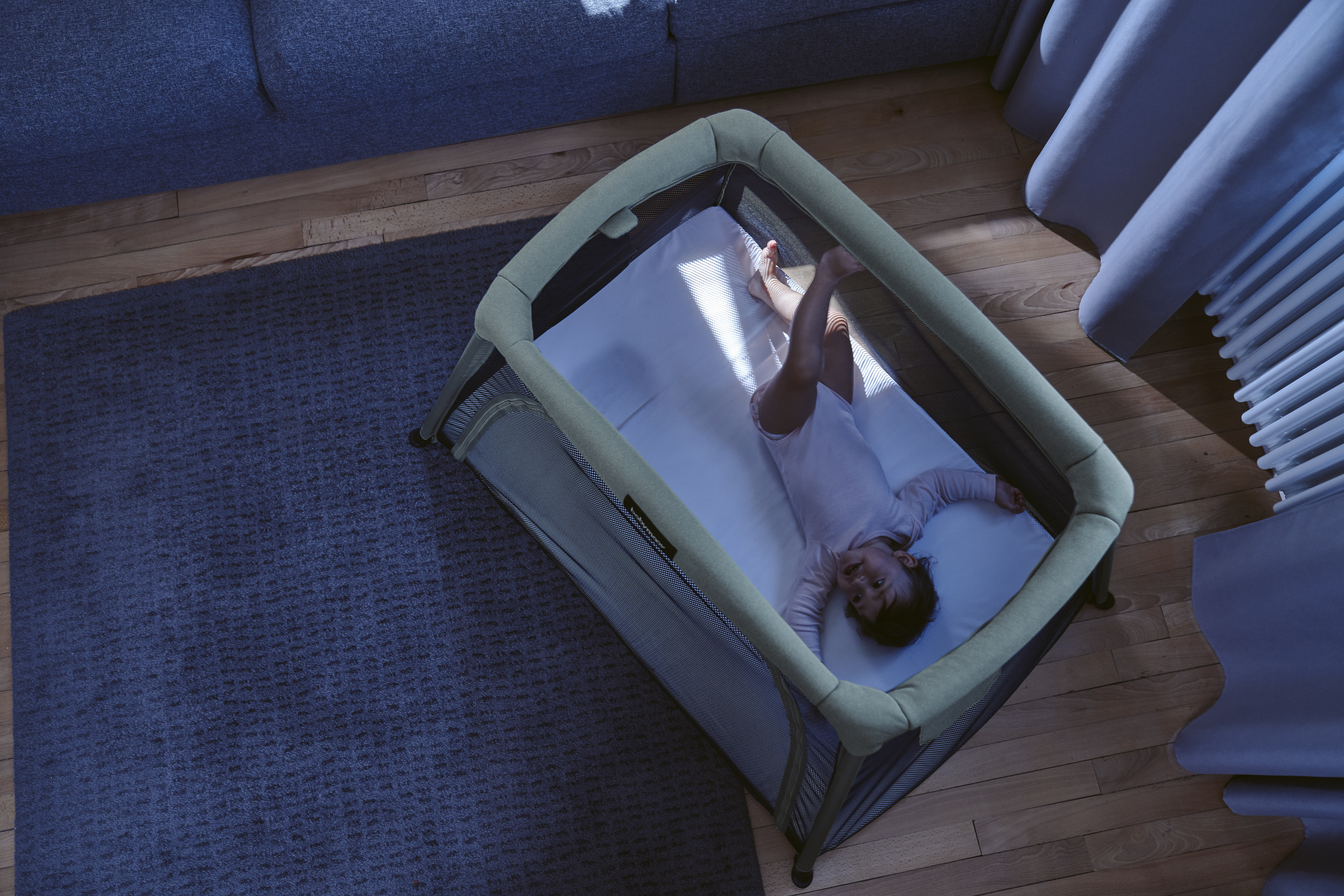 Quando il bambino sarà abbastanza grande da girarsi (circa 6 mesi), potrà continuare le sue notti tranquille sul grande materasso nella parte inferiore del lettino Moov and Comfy. Questo intelligente materasso funge anche da area giochi e può essere piegato e dispiegato più velocemente di un fulmine :)