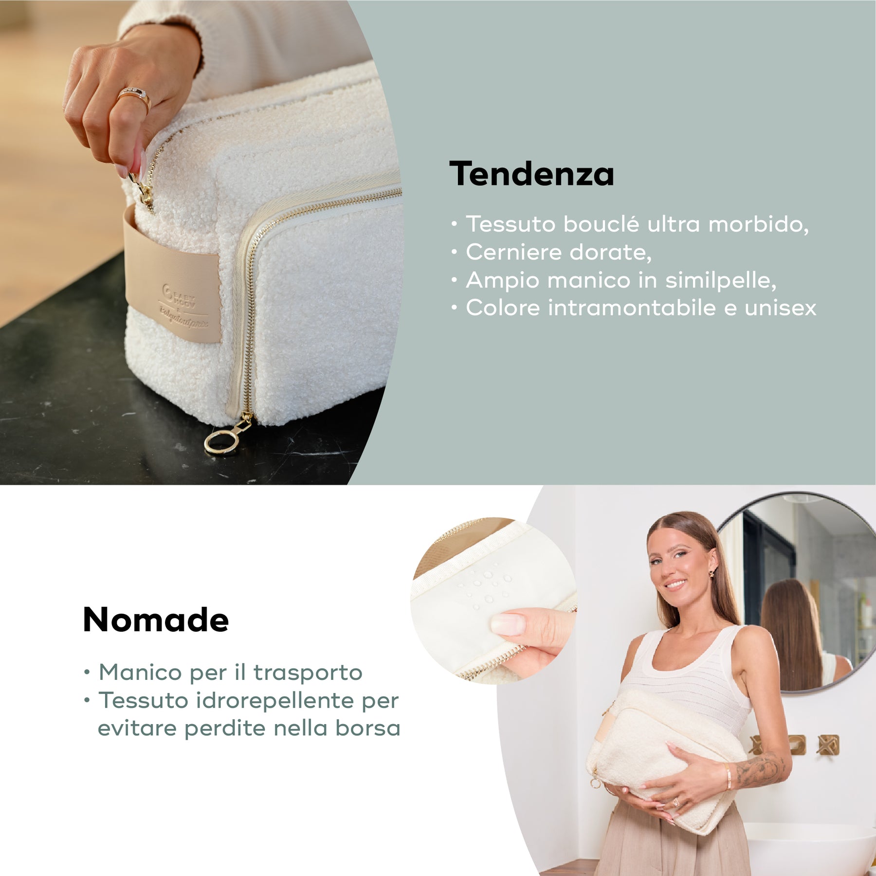 Il tessuto in spugna ultrasoffice, le cerniere dorate e l’ampia maniglia in similpelle rendono il beauty case Curl White un accessorio tanto pratico quanto estetico.Il suo stile senza tempo si abbina perfettamente agli altri prodotti della gamma Babymoov.