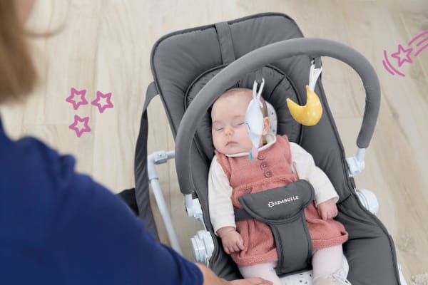 Perfettamente adattato dalla nascita, il sedile è morbido e ammortizzato. Il tuo bambino è ben sostenuto grazie al cuscino per la testa rimovibile e all'imbracatura a 3 punti.