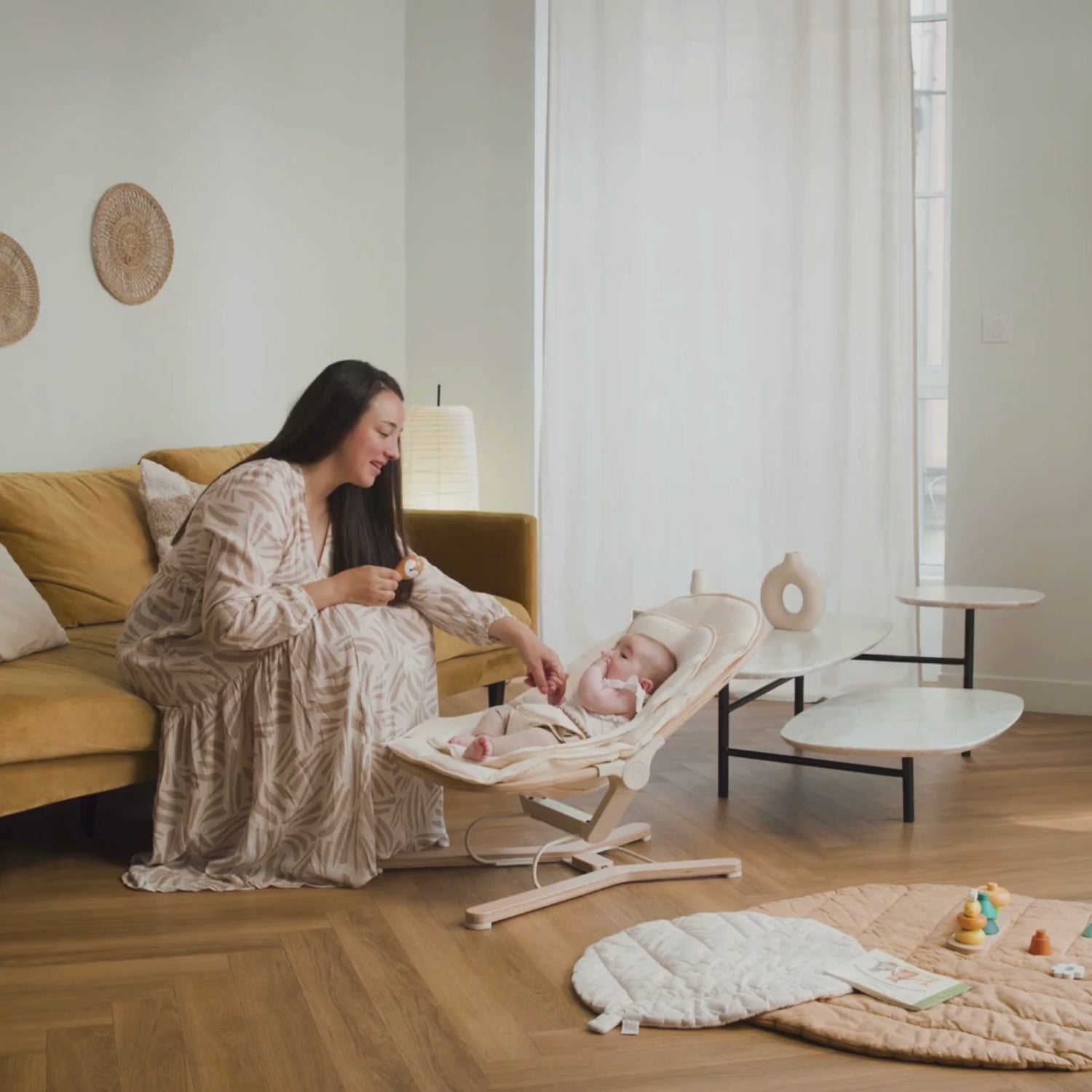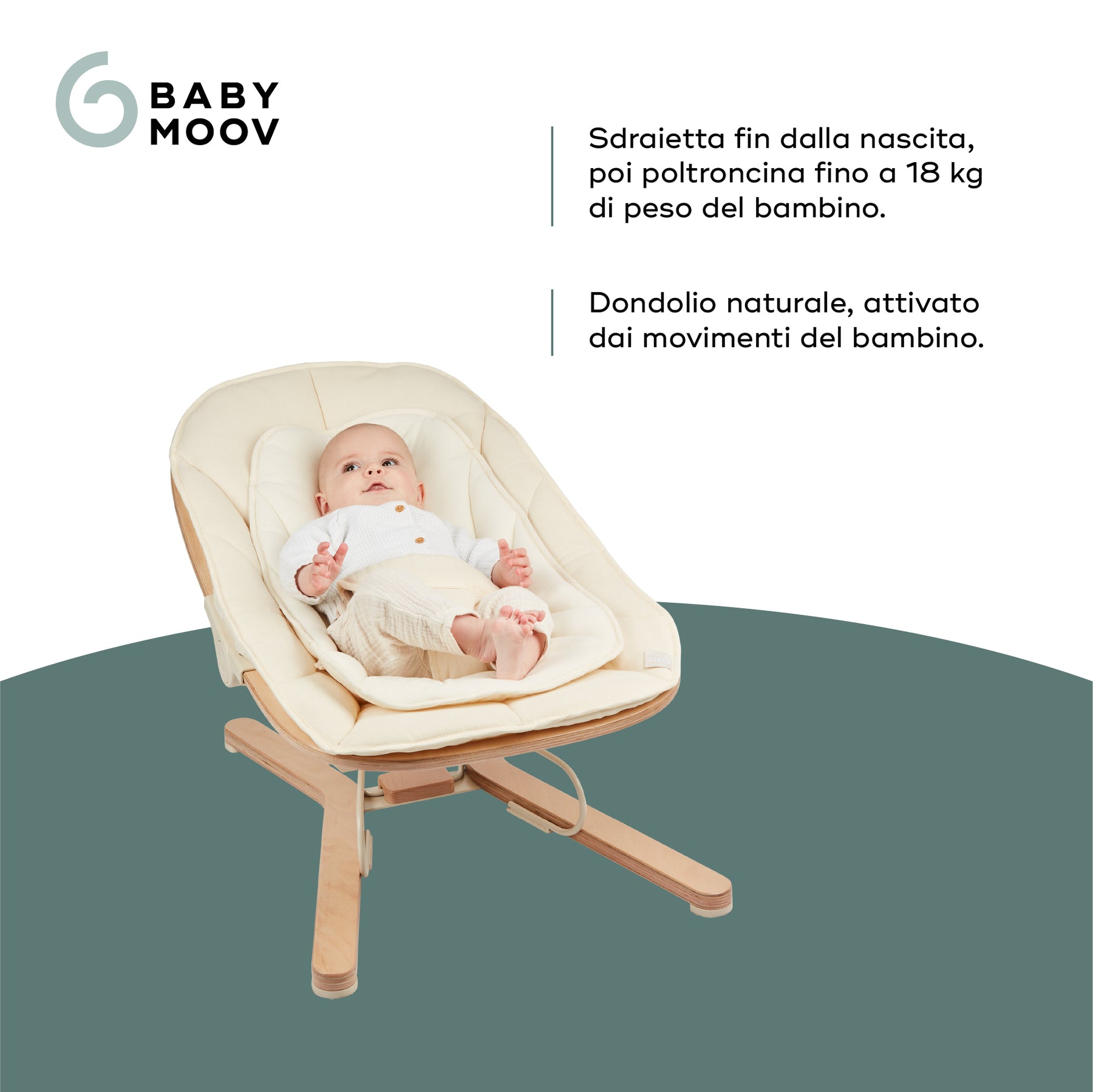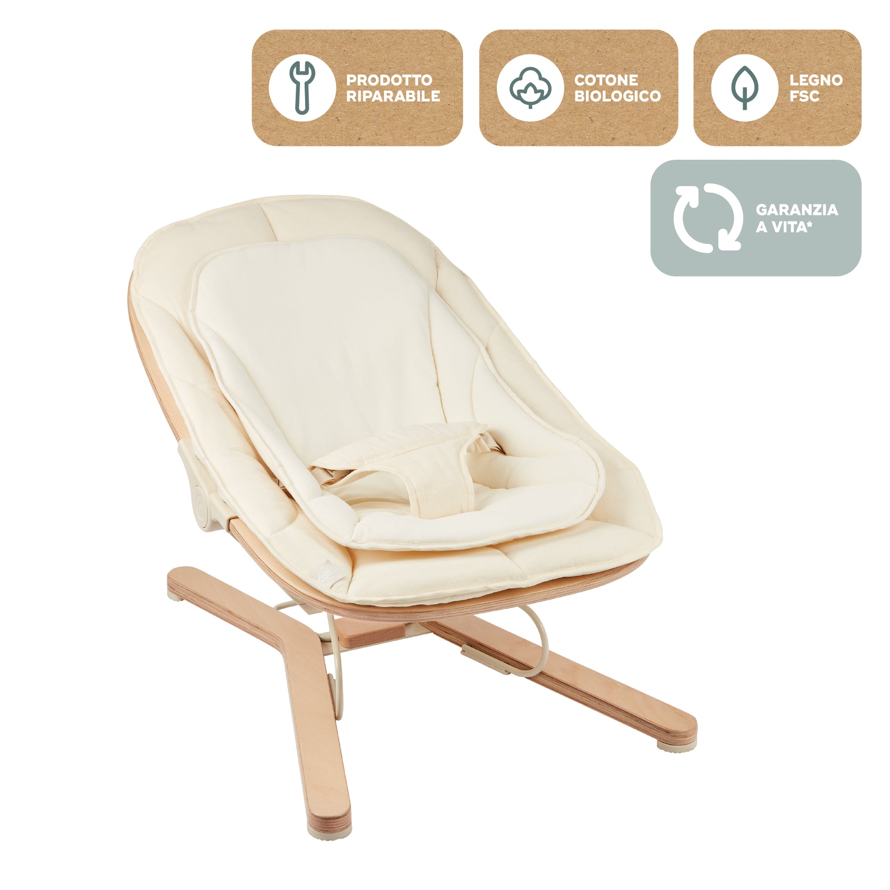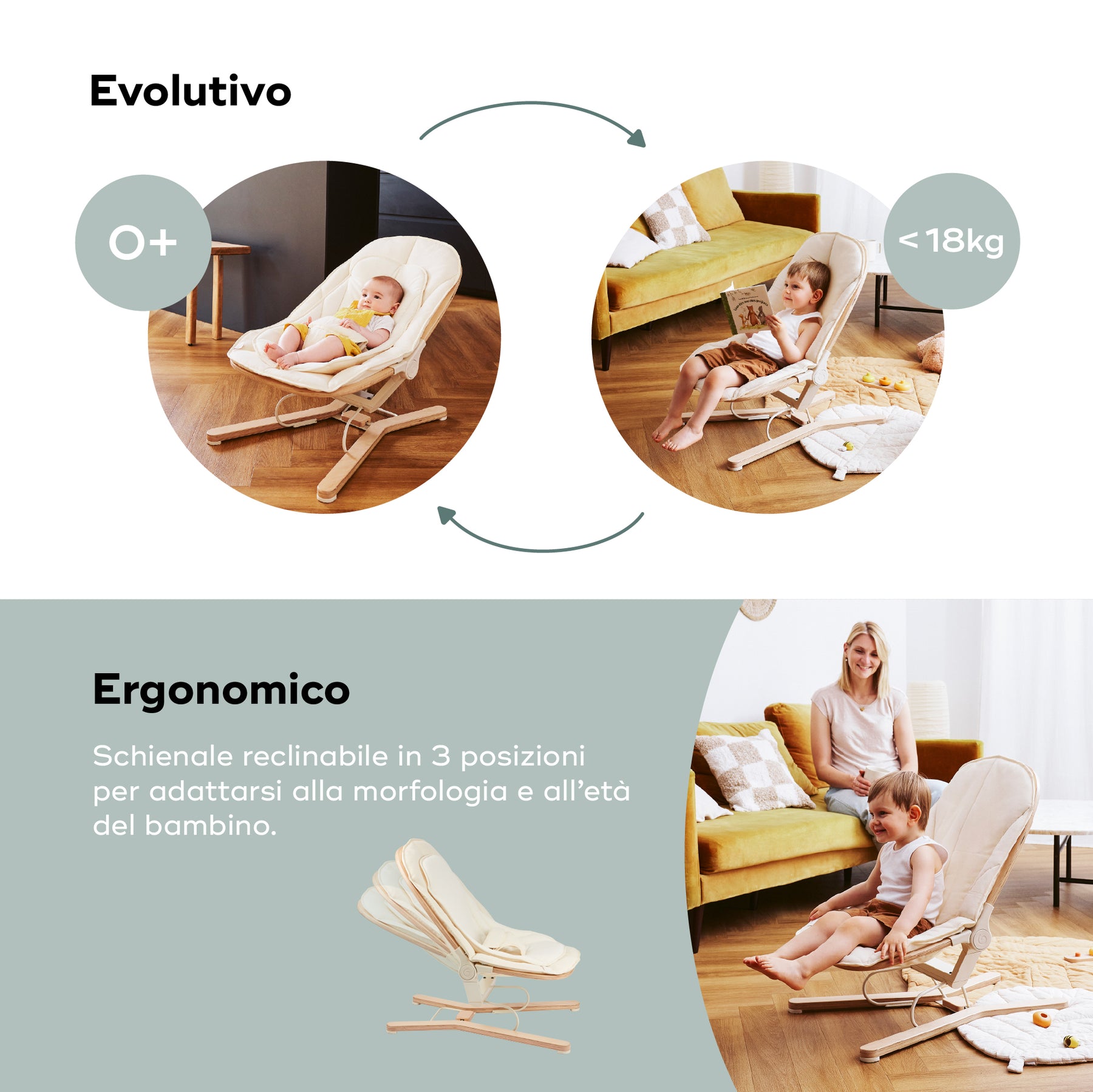 Lo schienale reclinabile in 3 posizioni si adatta a ogni fase: giocare, riposare o osservare. Perfetto per accompagnare la routine quotidiana!Design elegante e materiali eco-responsabili